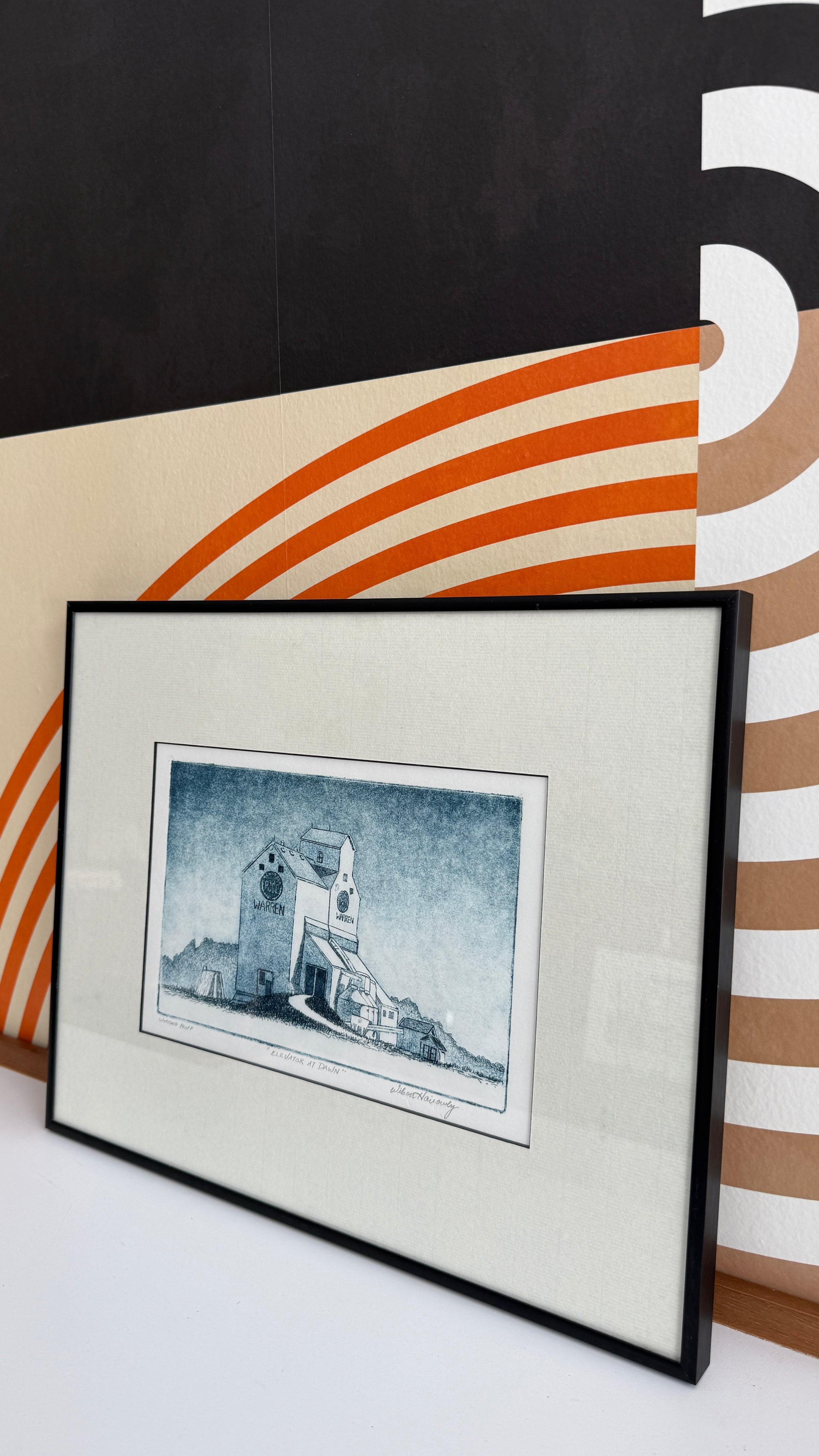 Framed artwork titled “Elevator at Dawn”, depicting a prairie grain elevator scene rendered in soft blue tones. The composition captures the quiet presence of a rural elevator against a textured sky, giving the piece a calm prairie atmosphere.