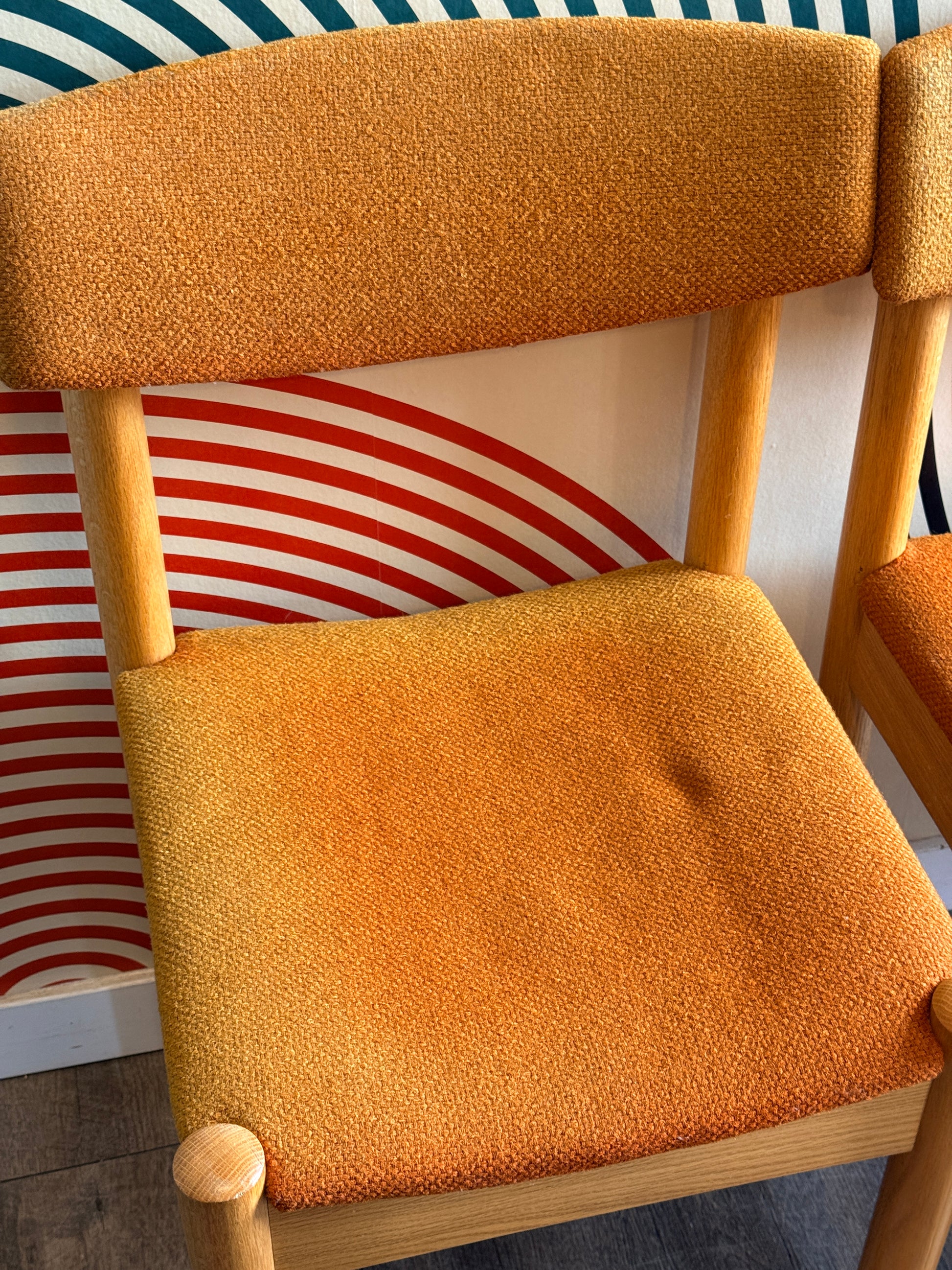 These chairs are both in good vintage condition, sun fading on the upholstery with some signs of wear appropriate with age and use.