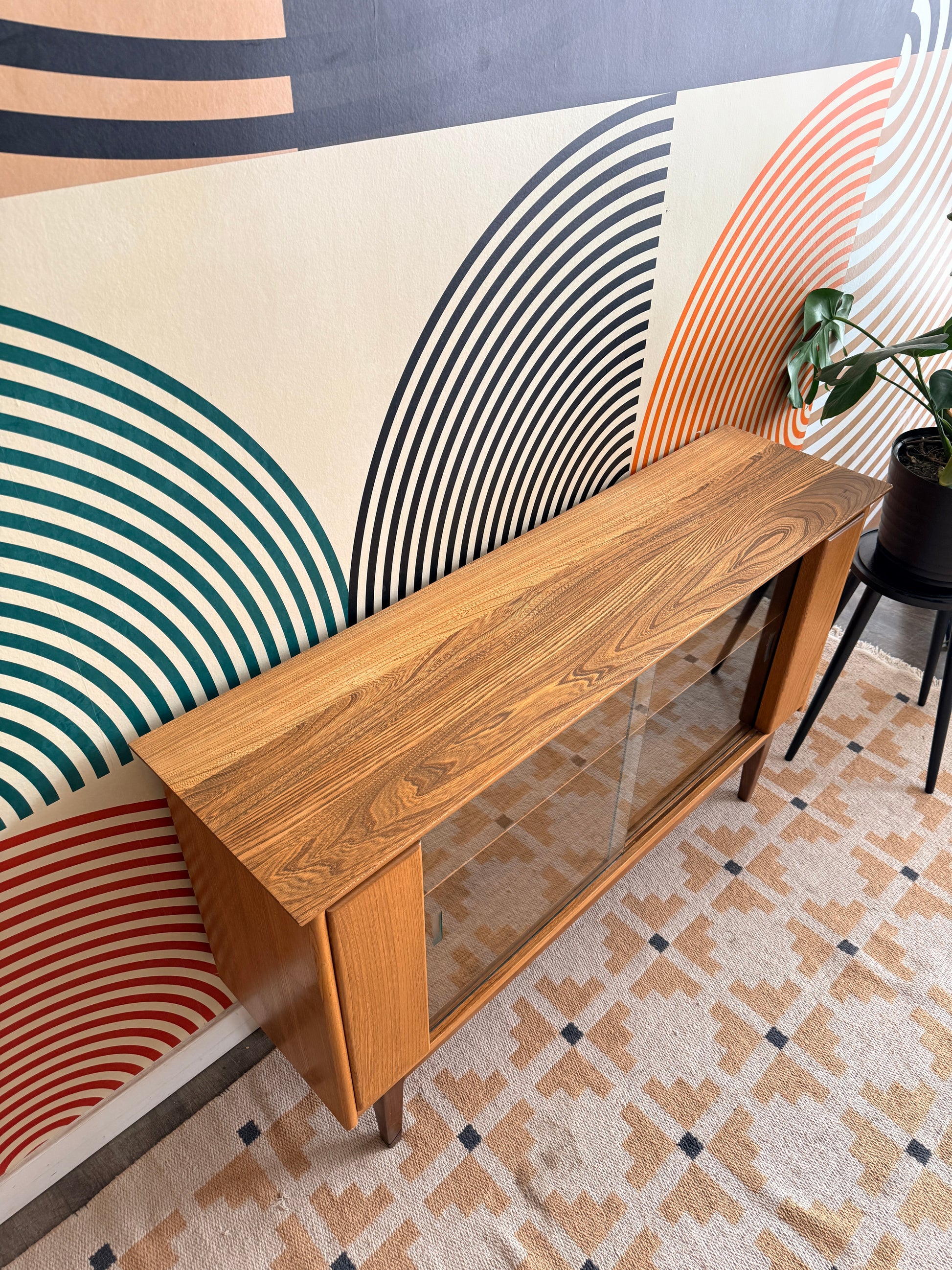 Beautiful solid ash display cabinet by Knechtel, featuring clean lines, sliding glass doors, and tapered legs. The warm ash grain is showcased throughout, giving the piece a light, organic feel while maintaining a refined mid-century silhouette.