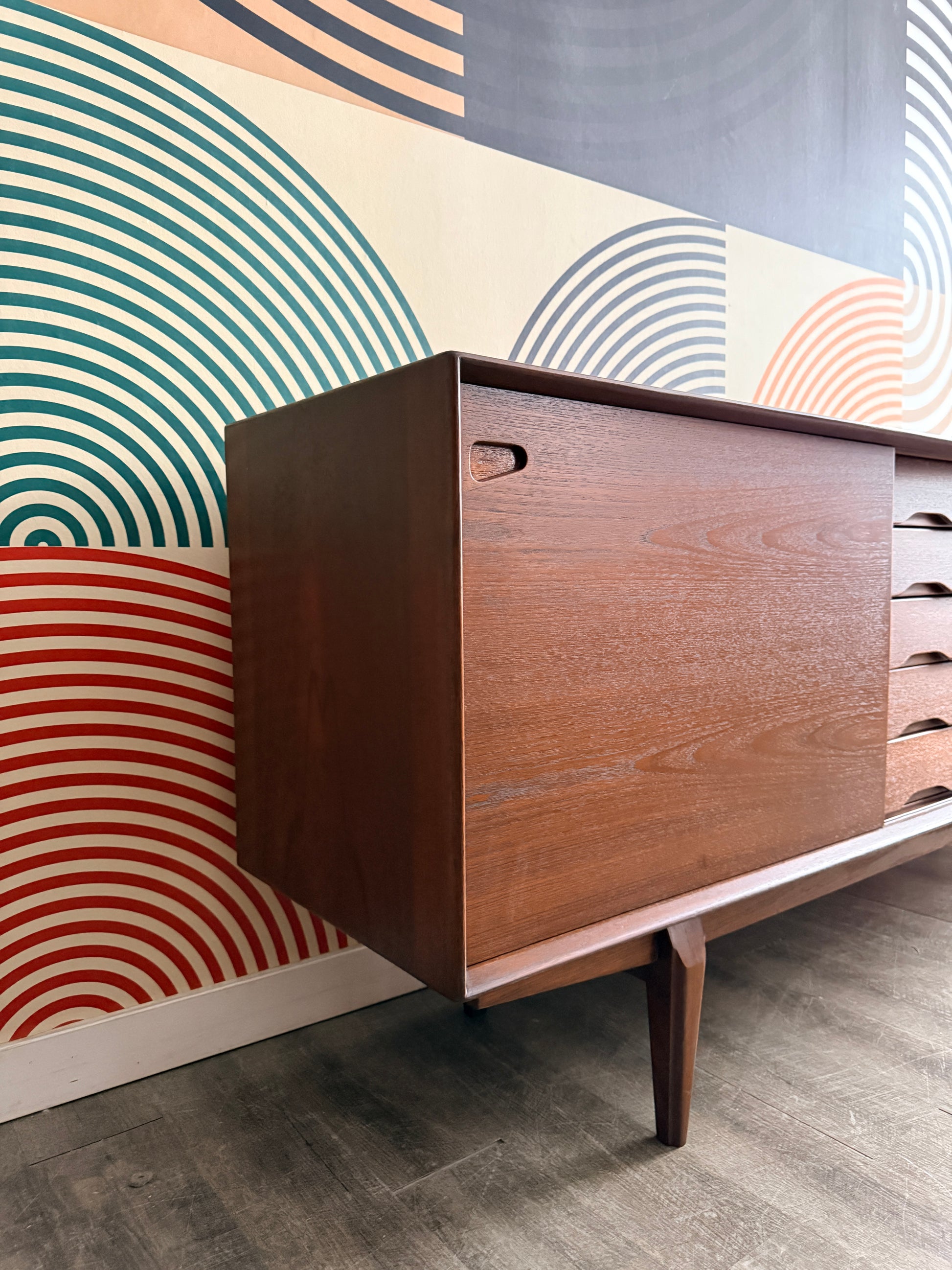 Mid-Century Modern sideboard featuring clean architectural lines, sculpted drawer pulls, and warm wood tones. A thoughtful mix of drawers and sliding-door storage offers both function and visual balance. Raised on tapered legs, this piece has a light, timeless presence that works beautifully in dining, living, or media spaces.