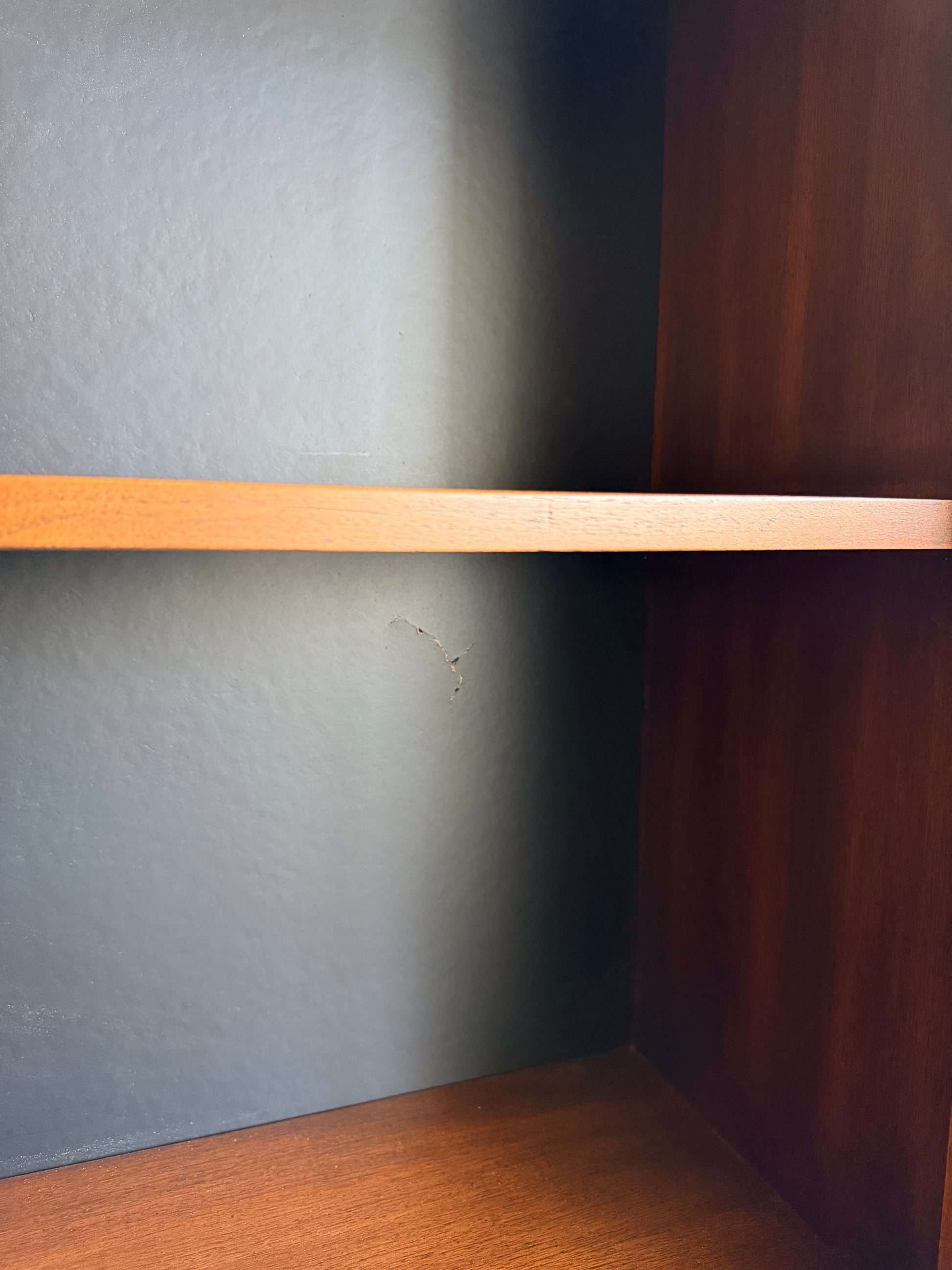 This walnut cabinet is in good condition with some signs of wear as shown in the photos. Please note that the shelves are not adjustable.